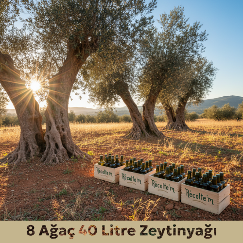 Kimyasal girdi kullanılmadan bakım yapılan 8 ağaçlık zeytinlikte gerçekleştirilen üretim, Récolte’m sistemi üzerinden takip edilir.Hasat sonunda size özel etiketlenmiş 1 litrelik 40 şişe (toplam 40 litre) zeytinyağı teslim edilir.