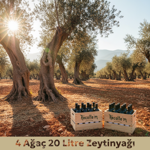 Kimyasal girdi kullanılmadan bakım yapılan 4 ağaçlık zeytinlikte gerçekleştirilen üretim, Récolte’m sistemi üzerinden takip edilir.Hasat sonunda size özel etiketlenmiş 1 litrelik 20 şişe (toplam 20 litre) zeytinyağı teslim edilir.